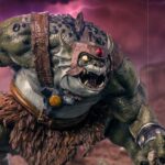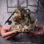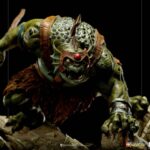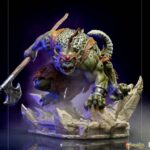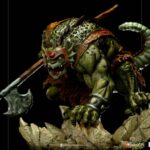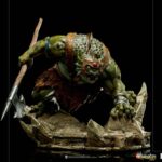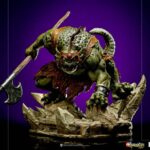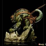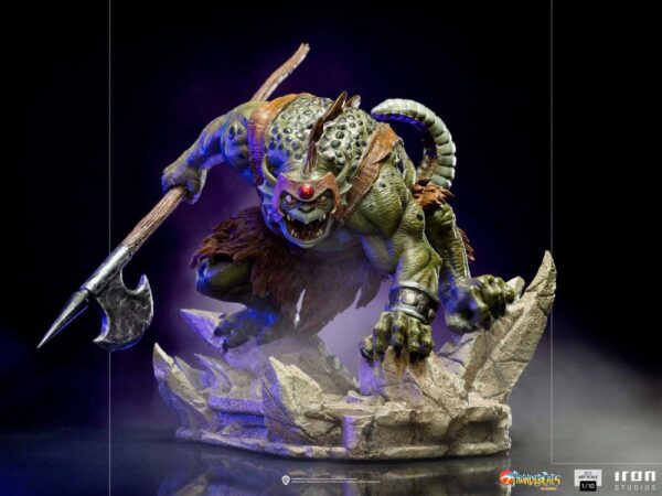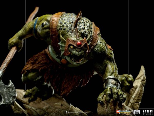 Slithering between rocks on the planet known as Third Earth, a stocky, green-skinned figure covered in scales, with spikes protruding from its back and a strong, muscular tail, firmly grips its battle-ax in its right fist. A member of the reptilian race of lizard-like anthropomorphic creatures from the planet Plun-Darr, Iron Studios presents the “Slithe – BDS ThunderCats – Art Scale 1/10” statue of the surly self-proclaimed commander of the Mutants, a group formed by the races of different animalistic humanoid barbarians and self-professed enemies of the ThunderCats.