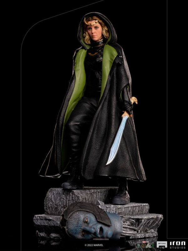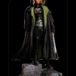 Inside the Time-Keeper’s chamber, spokespersons of the Time Variance Authority, ready to reach her objective, the Goddess of Mischief of an alternate Asgard, decapitated the head of one of the entities which turned out to be an android, concluding part of her revenge. Wielding her sword with Asgardian runes, wearing her green cloak and her golden tiara with horns (one of them broken), on a pedestal inspired by the scene described above with the robotic head at her feet, Iron Studios present the statue “Sylvie Loki Variant – Loki – Art Scale 1/10”, with the sorceress, Loki’s alternate version and ally, in the series of Marvel’s charismatic villain in the movies, produced for the Disney+ streaming service.
