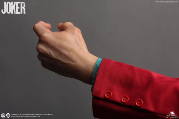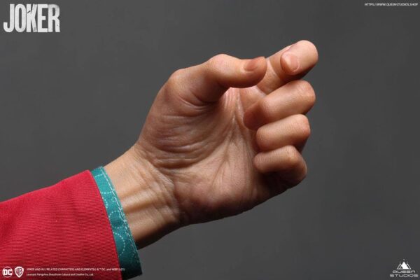 As Arthur becomes “Joker,” he takes to the streets and dances his way to the late-night show “Live! With Murray Franklin” to further celebrate this transformation. Queen Studios’ artist have chosen this staircase dance as the pose for the Joker 1:2 scale silicone statue. Fleck is stood mid-dance, lifting his left arm into the air, looking more content than ever. Joker is wearing his now iconic royal red suit, goldbrick yellow waistcoat and a patterned blue shirt.