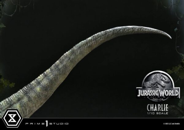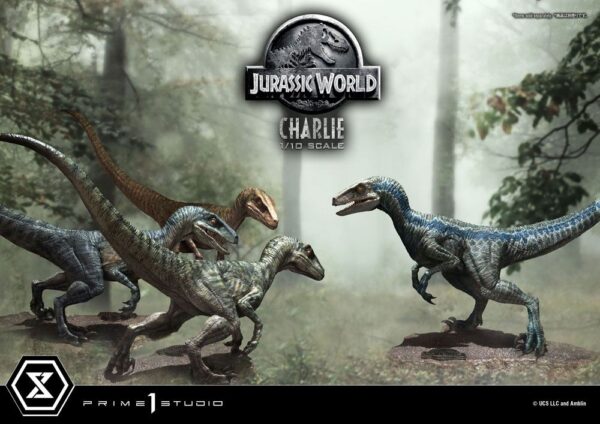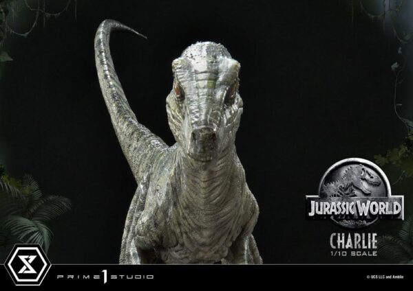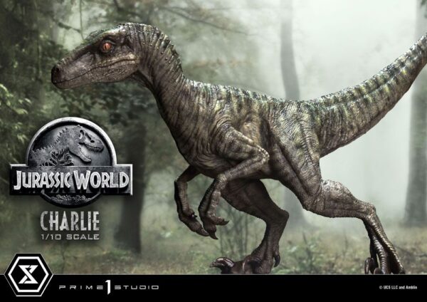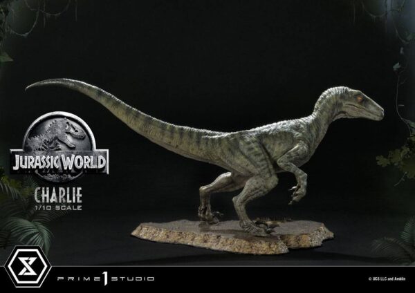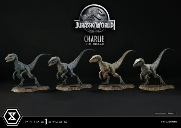 Charlie stands ready to take cues from the pack leader on a Jurassic World-themed earthen base sporting a bronze-finished Jurassic World logo towards the front.