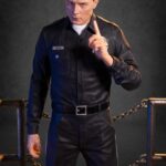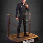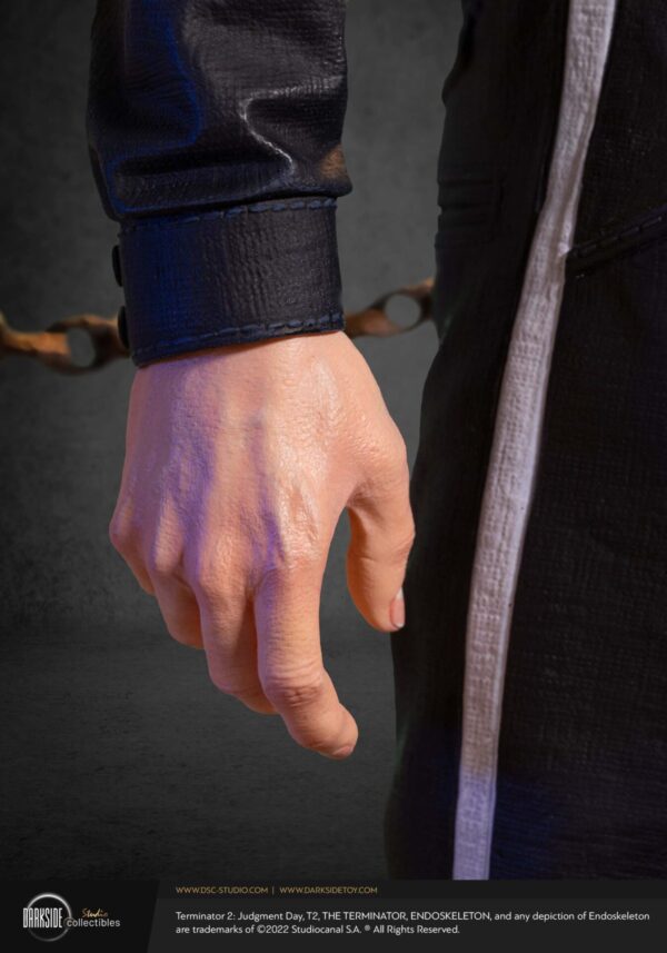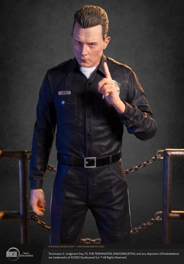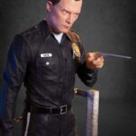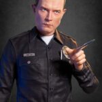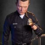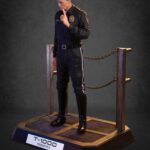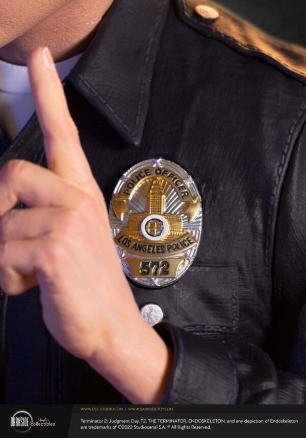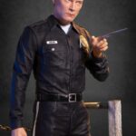 T-1000 is presented in his screen accurate high detailed dark blue LAPD uniform featuring high-definition textures and stitching lines, the LAPD badge, Austin name tag and pen on the shirt. The white strip along the seam of the trousers and hand sculpted boots completes a breathtaking hyper realistic hand sculpted costume.