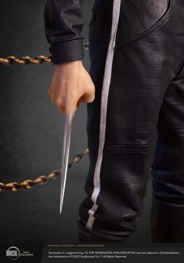 Representing the final battling scene between T-800, T-1000, & Sarah Connor in the film. T-1000 statue is hand sculpted to transmit a screen accurate feeling of the exact iconic “No” gesture moment in the film. A secondary screen accurate option of display is given with the left hand featuring the long sharp awl index finger used to stab the shoulder of Sarah Connor.