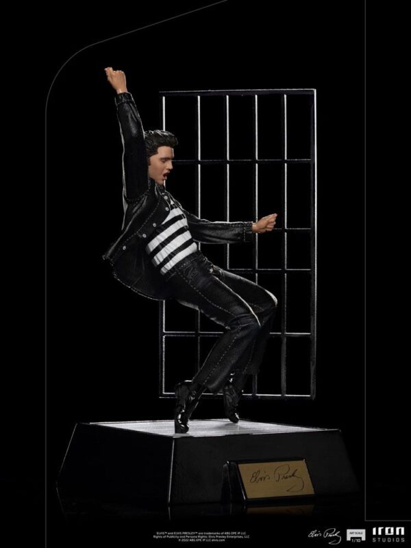 Jailhouse Rock is both the title of a song written by Jerry Leiber and Mike Stoller, one of Elvis Presley’s greatest hits, as well as the third movie of his career released in 1957. The film Jailhouse Rock entered the United States National Film Registry at the United States Library of Congress, immortalized because of its cultural relevance. In the plot, Vince Everett (Elvis Presley) is sentenced to prison after accidentally killing a man, and there, he befriends a former country singer who teaches him to play the guitar. When he is released, he starts his musical career to achieve fame and fortune. The climax of the film, replicated in this statue by Iron Studios, is the iconic scene in which Elvis sings Jailhouse Rock in a prison cell setting, set up in a TV studio. The song is ranked 67th on Rolling Stone magazine’s list of the 500 best songs of all time and is also on The Rock and Roll Hall of Fame museum’s list of the 500 most influential songs in the formation of rock and roll.
