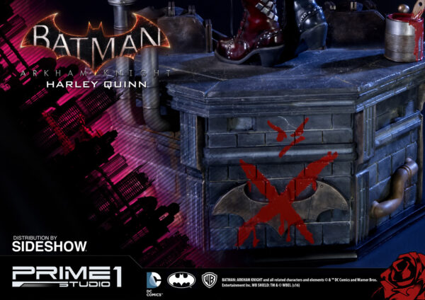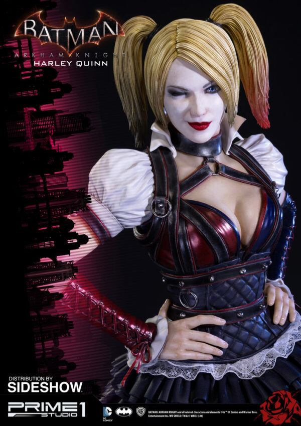 Sideshow and Prime 1 Studio are proud to present Harley Quinn from Batman: Arkham Knight. Harley and Batman’s foes united with Scarecrow to destroy Batman. and she still blamed him for the Joker’s death. Grief-stricken and vengeful. Harley brutally reasserted control of the Jokers gang. which threatened to fragment after his death. Freed from the Jokers domineering personality. Harley became a dangerous. and unpredictable new force in the Gotham City underworld. Harley fans. don’t miss your chance to add this crazy villainess to your Batman collection.